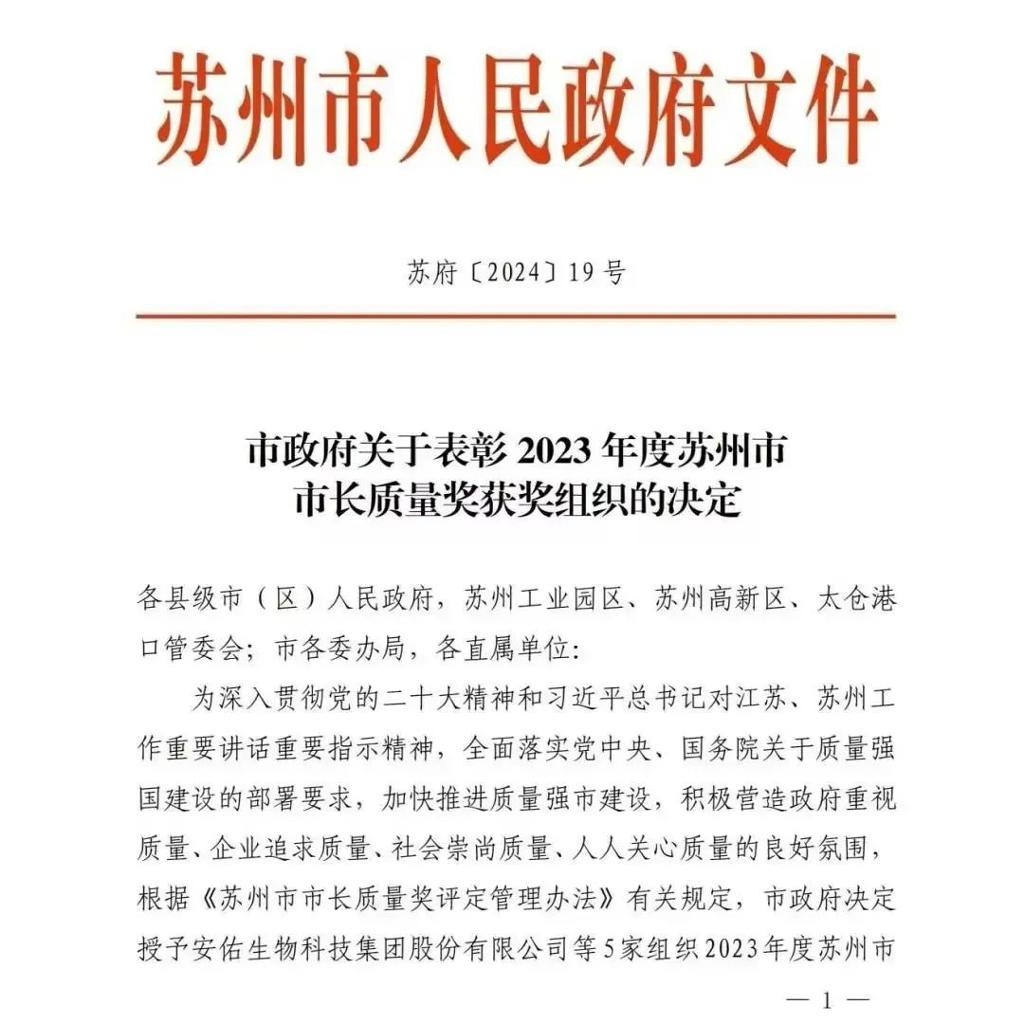 近日,苏州市人民政府发布了《关于表彰2023年度苏州市市长质量奖获奖组织的决定》,AG尊龙精电科技股份有限公司荣获“2023年度苏州市质量管理优秀奖”。